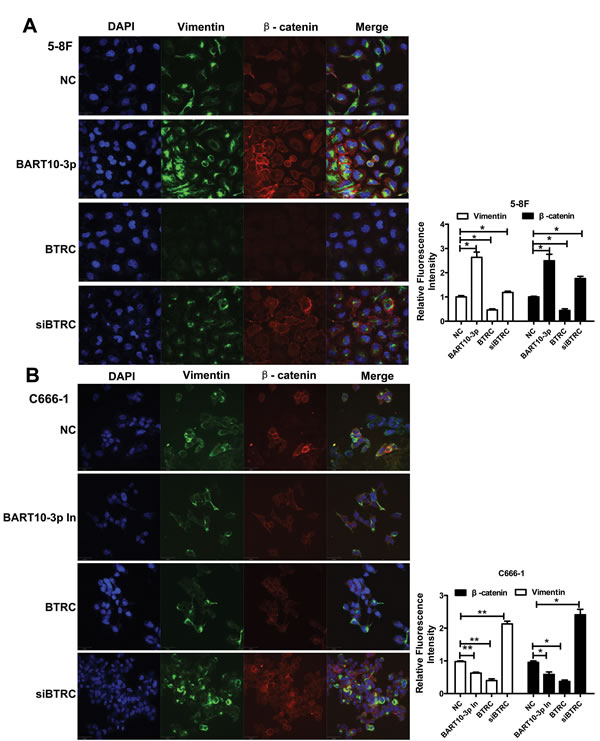 Figure 6: The effect of EBV-miR-BART10-3p on EMT in NPC cells was confirmed by immunofluorescence. The expression levels of Vimentin and β-catenin were examined by immunofluorescence assay in 5-8F A. or C666-1 B. cells transfected with EBV-miR-BART10-3p mimics (BART-10-3p), or BTRC expression vector (BTRC), EBV-miR-BART10-3p inhibitors (BART-10-3p In), or BTRC siRNA (siBTRC). Up-regulation of Vimentin and β-catenin by both EBV-miR-BART10-3p mimics and BTRC siRNA, as well as down-regulation of them by ectopic BTRC or EBV-miR-BART10-3p inhibitors were also confirmed by this assay (NC: negative control). Five randomly selected areas were scanned and data were shown as the mean ± standard deviation (right panel, *, p < 0.05; **, p <0.01).