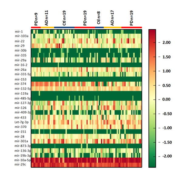 Figure 1: Heatmap of CSF exosomal differential miRNA profiles in PD and AD. Heatmap representation of the mean fold change in PD and AD related differential miRNA signature. Two-dimensional grid matrix displaying 27 exosomal miRNAs in CSF was obtained by the functional heat-map in R. Columns refer to time course comparison: 27 healthy controls, 28 AD patients and 47 PD patients. Rows stand for the 27 differential miRNAs. Each entry of the grid refers to relative fold (log2) between the expression level of a given miRNA in exosome relative to RNU6B in healthy controls. The color of each entry is determined by the value of that fold difference, ranging from green (negative values) to red (positive values).
