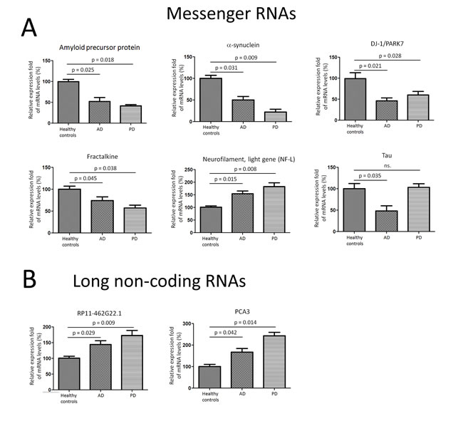 Messenger RNA transcripts and long non-coding RNAs were differentially expressed in CSF exosomes in PD and AD patients
