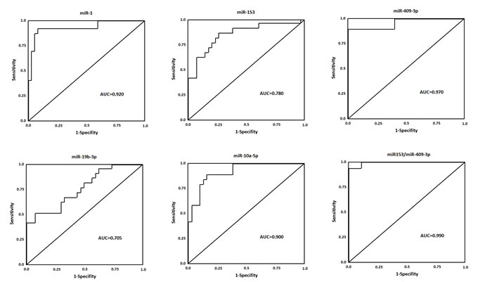 Figure 4: ROC curves for miRNAs that are significantly different in PD patients as compared to healthy controls. ROC curve with AUC for miR-1, miR-153, miR-409-3p, miR-19b-3p, and miR-10a-5p was performed using SPSS.