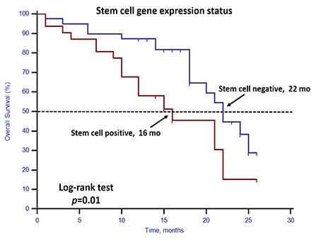 Figure 6: Kaplan–Meier estimates of PSA-PFS in 30 mCRPC patients who received docetaxel-based first-line chemotherapy according to stem cell gene expression status. Log-rank p = 0.01 (Cox HR: 2.65, (95% CI: 1.18–5.95)).