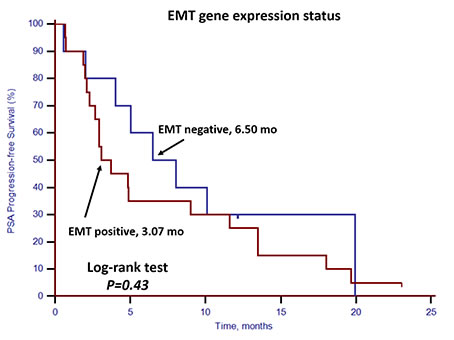 Figure 8: Kaplan–Meier estimates of PSA-PFS in 30 mCRPC patients who received docetaxel-based first-line chemotherapy according to EMT gene expression status. Log-rank p = 0.43 (Cox HR: 1.40, (95% CI: 0.61–3.23)).