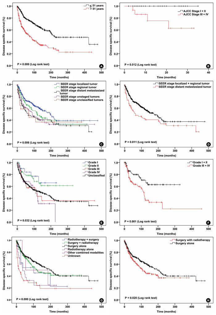 Figure 1: Disease specific survival curves of patients with solitary fibrous tumor compared according to (A) age, (B) AJCC stage, (C) and (D) SEER stage, (E) and (F) pathologic grade, (G) and (H) treatment modalities. Log-rank test was used to compare curves, and significance (P value) is shown on each panel.