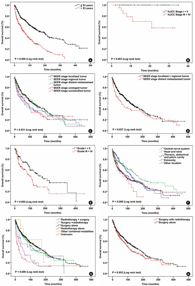 Figure 2: Overall survival curves of patients with solitary fibrous tumor compared according to (A) age, (B) AJCC stage, (C) and (D) SEER stage, (E) pathologic grade, (F) tumor location (G) and (H) treatment modalities. Log-rank test was used to compare curves, and significance (P value) is shown on each panel.