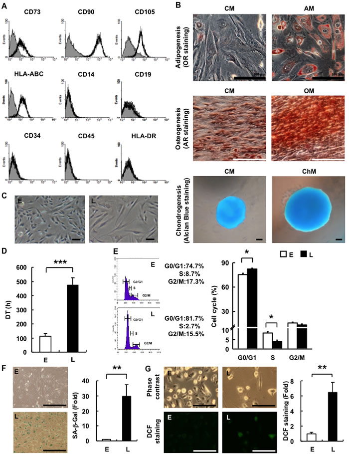 Figure 1: hAMSCs are multilineage cells which undergo in vitro replicative senescence. A. Characterization of hAMSCs. hAMSCs were analyzed for the expression levels of CD14, CD19, CD34, CD45, CD73, CD90, CD105, HLA-ABC, and HLA-DR by FACS. B. Multilineage differentiation capacity of hAMSCs towards adipogenesis (AM, OR staining, magnification, ×200), osteogenesis (OM, AR staining, magnification, ×200), and chondrogenesis (ChM, Alcian Blue staining, magnification, ×200). hAMSCs cultured in CM was used as negative control. Bar = 100µm. C. Morphology of E- and L-hAMSCs (phase-contrast, magnification, ×200). Bar = 200µm. D. DT of E- and L-hAMSCs. E. Cell cycle analysis of E- and L-hAMSCs. F. SA-β-Gal staining of E- and L-hAMSCs. Bar = 500µm. Percentage of SA-β-Gal positive cells was calculated and result was shown as fold change relative to E-hAMSCs G. DCF staining of E- and L-hAMSCs for ROS. Bar = 200µm. Percentage of DCF positive cells was calculated and result was shown as fold change relative to E-hAMSCs. *p < 0.05; **p < 0.01; ***p < 0.001. hAMSCs, human adipose tissue-derived mesenchymal stem cells; AM, adipogenic medium; OR, Oil Red O; OM, osteogenic medium; AR, Alizarin Red; ChM, chondrogenic medium; CM, complete medium; E-hAMSCs, early-passage hAMSCs; L-hAMSCs, late-passage hAMSCs; DT, doubling times; SA-β-Gal, senescence-associated β-galactosidase; DCF, 2’, 7’-dichlorofluorescein; ROS, reactive oxygen species.