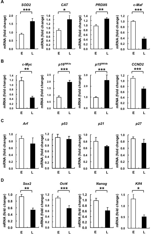 To further elucidate the molecular pathways involved in hAMSC senescent changes resulting in elevated ROS, decreased proliferative capacity, and altered differentiation capacity, we assayed for changes in the expression of related genes in E- and L-hAMSCs. We found that superoxide dismutases 2 (SOD2), catalase (CAT), and peroxiredoxin 6 (PRDX6) levels were significantly increased in L- compared to E-hAMSCs; levels of c-Maf—a TF known to be important in immune cell development [18] and recently found to mediate age- and ROS-related MSC differentiation capacity [6, 19]—were decreased in L-hAMSCs (Figure 3A). The growth arrest so prominent in most senescent cells is known to involve the Arf-p53-p21 and/or p15INK4b /p16INK4a –pRb pathways. In senescence, these pathways are activated and result in G1-cell cycle arrest [20]. We therefore assayed for changes in expression of these cell cycle-associated genes in E- and L-hAMSCs. We found that p15INK4b and p16INK4a, but not Arf, p53, p21 or p27 were significantly increased in L- compared to E-hAMSCs. In addition, the expression of cyclin D2 (CCND2), a G1-cell cycle regulatory gene, was decreased in L-hAMSCs. (Figure 3B, 3C). Interestingly, c-Myc, a TF now known to be important in both cell proliferation and inducing pluripotency [21], was also significantly downregulated in L-hAMSCs as well. Furthermore, we found that the embryonic stem cell pluripotency genes Sox2, Oct4, and Nanog [22] were significantly decreased in L- compared to E-hAMSCs. Klf4, another gene found to be important in maintaining/inducing pluripotency [21, 23] was significantly downregulated with hAMSC senescence as well (Figure 3D). These results suggest that senescence in hAMSCs involve induction of genes for antioxidant enzymes and p15INK4b /p16INK4a, as well as downregulation of c-Maf and pluripotency genes.