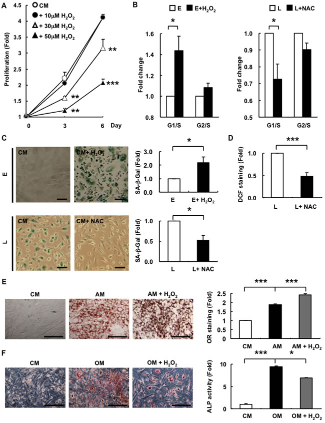 Figure 4: Exogenous ROS decreases the proliferation potential and alters differentiation capacity from osteogenesis towards adipogenesis in E-hAMSCs. A. In vitro proliferation of E-hAMSCs cultured in CM with or without H2O2 treatment. B. The measurement of cell cycle distribution was described in “Materials and Methods”. E-hAMSCs were treated with or without H2O2 (50μM, 24 h), and L-hAMSCs were treated with or without NAC (50μM, 24 h) C. SA-β-Gal staining and quantification were described in “Materials and Methods”. E-hAMSCs were treated with or without H2O2 (50μM, 12 days), and L-hAMSCs were treated with or without NAC (50μM, 6 h). Bar = 200µm D. DCF staining and quantification were described in “Materials and Methods”. L-hAMSCs were treated with or without NAC (50μM, 6 h). E. Adipogenesis and F. osteogenesis of E-hAMSCs cultured in CM, AM or OM with or without H2O2 treatment (30μM), respectively. Cells were cultured 2 days for adipogenesis and 21 days for osteogenesis. Bar = 200µm. The staining intensity of E-hAMSCs cultured in CM was set at 1. All data are representative of at least three independent experiments, and shown as mean values ± SEM. *p < 0.05; **p < 0.01; ***p < 0.001. ROS, reactive oxygen species; E-hAMSCs, early-passage hAMSCs; CM, complete medium; H2O2, hydrogen peroxide; SA-β-Gal, senescence-associated β-galactosidase; DCF, 2’, 7’-dichlorofluorescein; L-hAMSCs, late-passage hAMSCs; H2O2, hydrogen peroxide; NAC, N-acetyl cysteine.