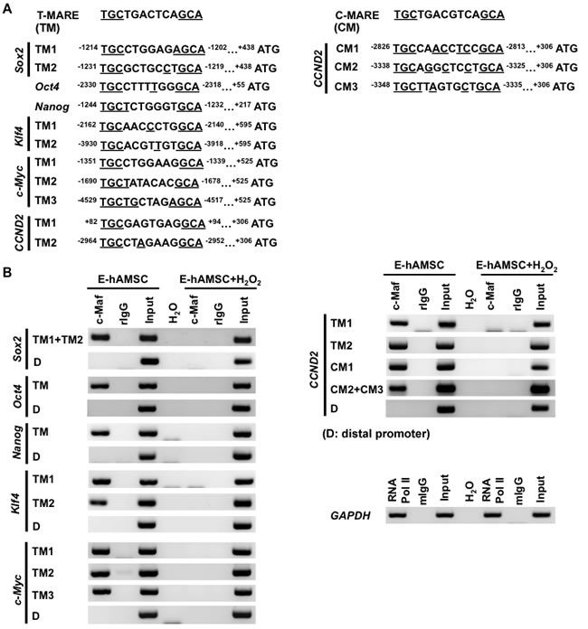To elucidate whether c-Maf mediate senescence changes in hAMSCs by directly binding to the promoter regions of senescence-altered genes, we performed sequence analysis in these regions to identify cis-acting regulatory Maf recognition element (MARE), the binding element for c-Maf [25]. Currently, known palindromic MAREs include the phorbol 12-O-tetradecanoate-13-acetate-responsive element (T-MARE; TGCTGACTCAGCA) and the cyclic AMP-responsive element (C-MARE; TGCTGACGTCAGCA) [26]. The TGC/GCA flanking motif is crucial for Maf binding and is conserved. Using in silico analysis, we identified various putative T- and C-MARE sites on the promoter regions of senescence-altered genes in position from 5000 base pair (bp) upstream to translation initiation site (Figure 6A). Software analysis revealed that nearly all predicted MARE sites were at distal promoter regions (more than 1000 bp from the transcription start site); for T-MARE, elements could be found on the promoters of Sox2, Oct4, Nanog, Klf4, c-Myc, and CCND2, whereas for C-MARE, sites only could be found on CCND2 (Figure 6A). To investigate whether c-Maf directly interacts with these MARE sites and the putative relationship with H2O2 exposure, a chromatin immunoprecipitation (ChIP) assay was performed using either untreated or H2O2-treated E-hAMSCs. We found that c-Maf directly bound to T-MARE sites on the promoters of Sox2, Oct4, Nanog, Klf4, c-Myc, and CCND2; c-Maf binding could be demonstrated in C-MARE sites on the promoters of CCND2 (Figure 6B). Moreover, the binding capacity of c-Maf at all sites was strongly decreased by exogenous H2O2. Taken together, the data demonstrate a mechanism by which ROS through c-Maf alters differentiation as well as proliferative/self-renewal capacity, the latter via transcriptional regulation of cell cycle- and pluripotency-related genes into a cellular program of senescence in hAMSCs.