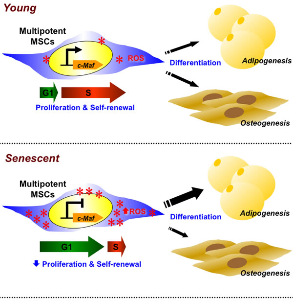 In conclusion, we provide mechanistic insight into the molecular changes of ROS-mediated senescent changes in hAMSCs. We found that c-Maf is transcriptional regulated by ROS and acts as a master TF in controlling multiple stem cell programs of proliferation, self-renewal, and lineage commitment. Our findings demonstrate the strong detrimental effects of ROS on multiple aspects of stem cell function with c-Maf playing a central role in these processes.
