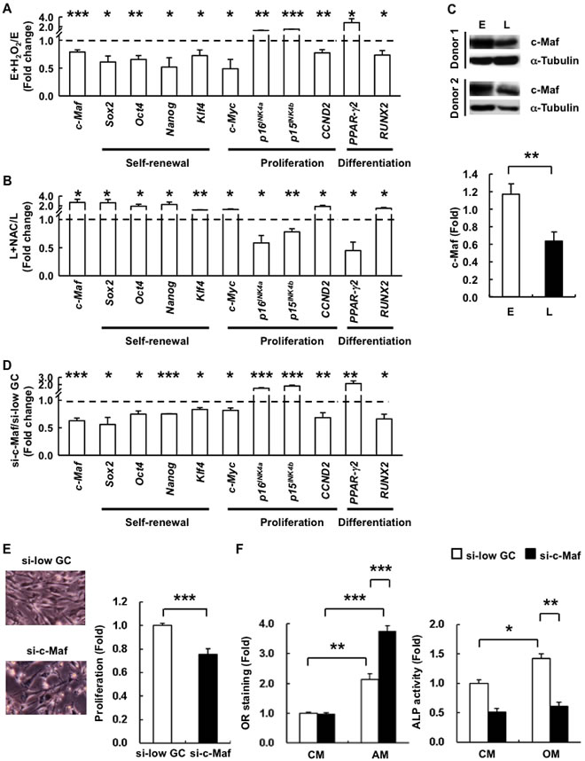 Figure 5: c-Maf is involved in H2O2-induced replicative senescence and adipogenic differentiation bias in hAMSCs. RT-PCR was performed to detect the expression of senescence-related genes, including differentiation-associated genes, cell cycle-associated proteins, and pluripotency markers in A. E- and B. L-hAMSCs treated with or without H2O2 or NAC, respectively. The expression of each gene was normalized against β-actin and the result was presented as fold change compared with the untreated cells C. The expression of c-Maf in E- and L-hAMSCs was detected by western blotting. α-Tubulin was used as internal control. D. RT-PCR was performed to detect the expression of senescence-related genes in E-hAMSCs after RNA silencing of c-Maf by siRNA specific for c-Maf (si-c-Maf) or non-target siRNA (si-low GC). The expression of each gene was normalized against β-actin and the result was presented as fold change compared with si-low GC-treated cells. E. Morphology and in vitro proliferation of si-c-Maf- and si-low GC-E-hAMSCs. F. si-c-Maf- and si-low GC-E-hAMSCs were cultured in CM, AM or OM and measured by OR staining or ALP activity for adipogenesis and osteogenesis, respectively. The staining intensity of si-low GC-E-hAMSCs in CM was set at 1. All data presented are mean values ± SEM from at least three independent experiments. *p < 0.05; **p < 0.01; ***p < 0.001. H2O2, hydrogen peroxide; hAMSCs, human adipose tissue-derived MSCs; RT-PCR, reverse transcription-polymerase chain reaction; E-hAMSCs, early-passage hAMSCs; L-hAMSCs, late-passage hAMSCs; H2O2, hydrogen peroxide; NAC, N-acetyl cysteine; siRNA, small interfering RNA; si-c-Maf, specific knockdown of c-Maf; CM, complete medium; AM, adipogenesis medium; OM, osteogenesis medium; OR, Oil Red O; ALP, alkaline phosphatase.