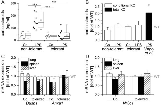 Figure 2: Endogenous corticosteroid levels and GR-mediated transcription in LPS-sensitive and LPS-tolerized WT mice. A. Mice were either sham-treated (non-tolerant / sensitive) or tolerized towards LPS by repeated low dose LPS injections, followed by either sham- (Co) or high-dose LPS treatment. Serum corticosteroid levels were assessed using a corticosterone ELISA kit (Enzo Life Sciences) according to the manufacturer’s instructions. B.-E.: Tissue samples of sham-treated (n-tol, non-tolerant) or LPS-tolerized (tol) WT mice were analyzed for Gilz (B, previously presented in [22]), Anxa1 C., Dusp1 D. and Nr3c1 expression. mRNA expression was measured and normalized to Rn18s. Data are shown as individual values and 25th/75th percentile boxes with arithmetic medians (cross), geometric medians (line), and 10th/90th percentile as whiskers; n = 10-12 per treatment group. *p < 0.05, **p < 0.01, ***p < 0.001 (A: ANOVA with Bonferroni’s post hoc test, B-D: Student’s t-test).