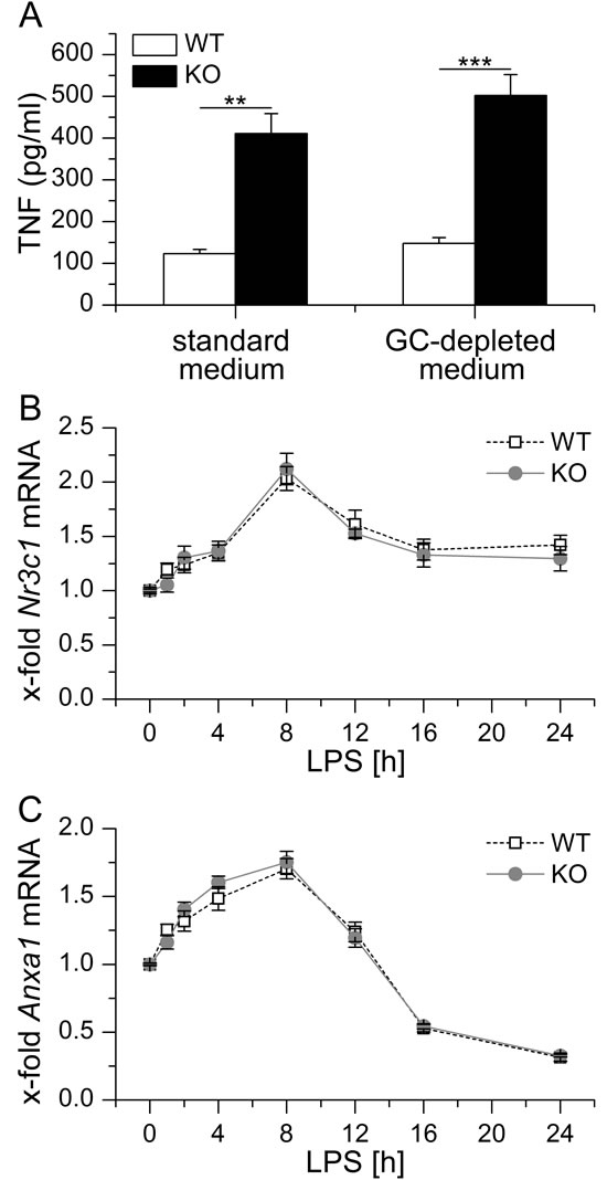Figure 4: A. BMM were either kept in standard or GC-depleted medium, tolerized towards LPS by LPS pretreatment (100 ng/ml) for 24 h and re-challenged with LPS (1 µg/ml) for 4 h. TNF secretion was assessed by bioassay. Data were previously shown in [22]. B., C. BMM were treated with 100 ng/ml LPS for up to 24 h. Nr3c1 B. and Anxa1 C. mRNA levels were determined by qPCR, normalized to Rn18s and expressed as x-fold of untreated WT BMM (n = 4, duplicates). No significant differences in Nr3c1 or Anxa1 expression were observed between WT and KO cells (p > 0.05, ANOVA with Bonferroni’s post hoc test).