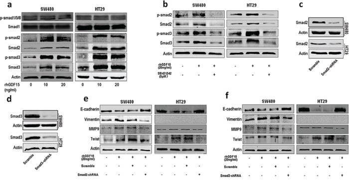 Figure 4: GDF15 regulates EMT through activating TGF-β signal pathway. a. The expression and phosphorylation level of Smad1/5/8, Smad2 and Smad3 in SW480 and HT29 cells with rhGDF15 treatment. b. The expression and phosphorylation level of Smad2 and Smad3 in SW480 and HT29 cells with TGF-β receptor inhibitor SB431542 treatment. c. Knockdown of Smad2 in SW480 and HT29 cells. d. Knockdown of Smad3 in SW480 and HT29 cells. e. The rescue assay for E-cadherin, vimentin, MMP9 and Twist expression in SW480 and HT29 cells using Smad2 shRNA. f. The rescue assay for E-cadherin, vimentin, MMP9 and Twist expression in SW480 and HT29 cells using Smad3 shRNA.