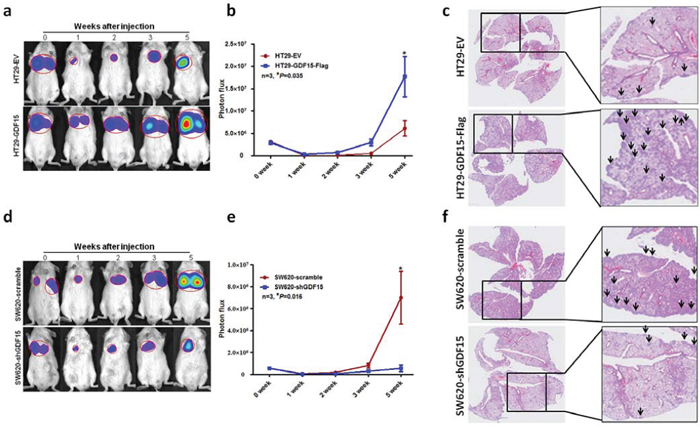 Figure 5: GDF15 promoted metastasis in vivo. a. Representative images of luciferase signals and b. quantification of photon flux for metastases by tail-vein injection of HT29-EV and HT29 GDF15 overexpression cells in immunodeficient mice. c. HE staining for pulmonary metastatic foci from HT29-EV and HT29 GDF15 overexpression cells (The arrows indicated the metastatic foci). d. Representative images of luciferase signals and e. quantification of photon flux for metastases of SW620 scramble and SW620 GDF15 knockdown cells in immunodeficient mice. f. HE staining for pulmonary metastatic foci from SW620 scramble and SW620 GDF15 shRNA cells (The arrows indicated the metastatic foci).