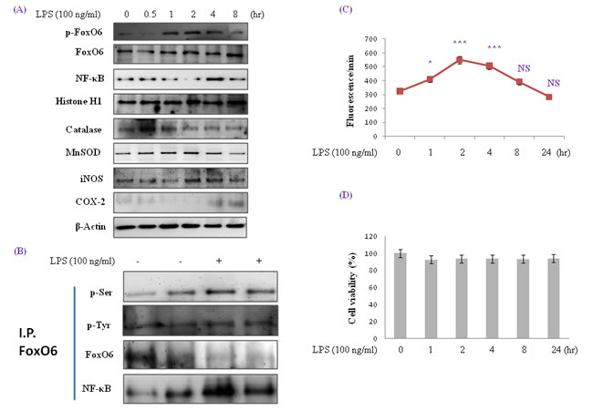 Figure 1: Enhancement of FoxO6 phosphorylation and NF-κB protein levels in LPS-treated HepG2 cells. HepG2 cells were treated with 100 ng/ml LPS for various times. Samples loaded on sample gel were probed with β-actin and histone H1. A. Nuclear levels of FoxO6 and NF-κB and cytoplasmic levels of catalase, MnSOD, iNOS, and COX-2 were noticeably diminished after LPS treatment for 0.5 to 8 hr. B. Immunoprecipitated FoxO6 was found to be physically associated with NF-κB by Western blotting. C. Quantitative analysis was performed by measuring DCFDA fluorescence after treating plate with vehicle or 100 ng/ml LPS for 1 to 24h. Results were obtained using one-factor ANOVA: ***p < 0.001 vs. LPS untreated cells. D. Cells were treated with 100 ng/ml LPS for 24hr. The MTT assay used is described in Materials and Methods.