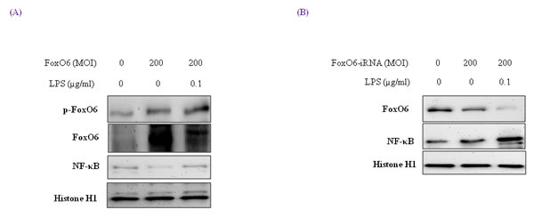 Figure 2: Activation of NF-κB through FoxO6 by LPS. HepG2 cells were grown to 80% confluence in 100 mm dishes in DMEM, pre-treated (1 day) with or without FoxO6 (100 MOI), and then stimulated with 100 ng/ml LPS. A. HepG2 cells were pretransduced with 200 MOI of FoxO6 vector in the absence or presence of LPS. Cells were analyzed by Western blotting using p-FoxO6, FoxO6, NF-κB, and Histone H1 antibody. B. After stimulating HepG2 cells with LPS (100 ng/ml) in the absence or presence of FoxO6-siRNA (200 MOI), levels of NF-κB were determined in cell extracts.