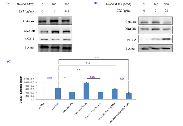 We also examined the effect of oxidative stress on FoxO phosphorylation. As shown in Figure 1, LPS enhanced FoxO6 phosphorylation at Ser and reduced unphosphorylated FoxO6 levels in LPS-treated HepG2 cells. In addition, we treated cells with FoxO6-virus (200 MOI) for 1 day, and then incubated them with 100 ng/ml LPS for 6 hr and assessed catalase, MnSOD, and COX-2 protein levels. Catalase and MnSOD levels were noticeably increased in FoxO6-virus transduced cells and COX-2 levels were decreased (Figure 4A). In addition, catalase and MnSOD also reduced inductions levels by LPS in FoxO6-siRNA vector-transduced cells (Figure 4B).