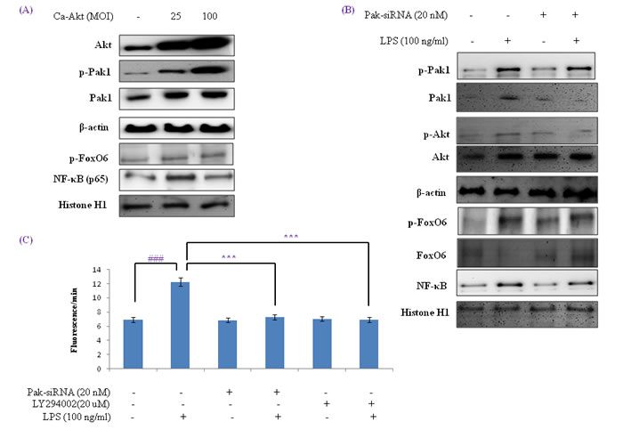 Figure 7: Activation of NF-κB by the Pak1 and Akt pathways in HepG2 liver cells. A. HepG2 cells were transduced with or without Ca-Akt vector (25 or 100 MOI), and analyzed by Western blotting using Akt, p-Pak1, Pak1, β-actin, p-FoxO6, p65, and Histone H1 antibody. B. Cells were transfected with or not with Pak1-siRNA transfected (20 nM for 2 days) and then stimulated with 100 ng/ml LPS for 2 hr. Levels of phosphorylated Pak1, Akt, FoxO6 and NF-κB were assessed in cell extracts. C. Quantitative analysis was performed by measuring DCFDA fluorescence in Pak1-siRNA (20 nM, 2 days) or LY294002 (20 µM, 2h) transfected cells or non-transfected cells with vehicle or 100 ng/ml LPS for 2 hr. Results were obtained using one-factor ANOVA: ###p < 0.001 vs. LPS untreated cells; ***p < 0.001 vs. LPS treated cells.