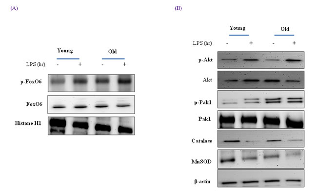 In addition, we examined the signaling molecules that lead to Akt activation by oxidative stress, which is known to activate PI3K and its downstream target Akt. Although Akt levels were not changed during aging (Figure 8B), LPS-treated old rats showed higher levels of phosphorylated Akt (Figure 8B). These observations support the notion that FoxO6 binds the catalase and MnSOD gene for transactivation, and thus, contributes to Akt activation.