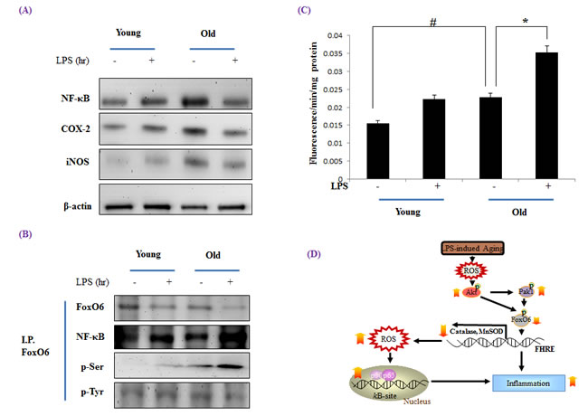 Figure 9: Increased NF-κB activation during LPS induced aging. Western blot analyses of liver nuclear and cytosolic A. NF-κB, COX-2, and iNOS levels were performed using the nuclear and cytosolic proteins of LPS treated old rats. Results are representative of three independent experiments. B. Nuclear extracts were prepared from the liver of young and old LPS treated rats. Immunoprecipitated FoxO6 was determined to be physically associated with NF-κB by Western blotting. C. ROS generation in LPS treated old rats was assessed in liver homogenates using the DCFHDA method. Results are presented as means ± SEs of 4 rats. Young = 6 months old; Old = 24 months old. Results of one factor ANOVA: #p < 0.05 vs. Young rats; *p < 0.05 vs. LPS treated age-matched rats. D. Possible mechanism of the effect of FoxO6 on LPS stimulated aging. ROS, reactive oxygen species; FoxO6, Forkhead transcription factor O6; NF-κB, Nuclear transcription factor κB; Pak1, P21-activated kinase.