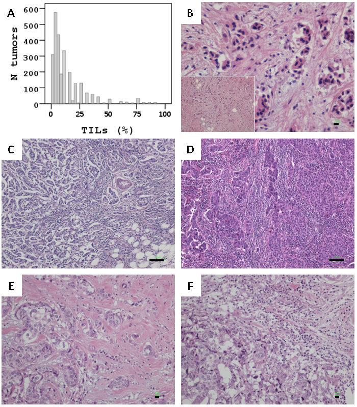 Figure 1: Stromal TILs in breast carcinomas. A. Distribution of TILs rates in the study population. B. < 5% (Bar: 10um); C. 50% (Bar: 100um); D. 75% (Bar: 100um) TILs homogeneously dispersed in these tumors. E and F: Same case, overall 35% TILs, heterogeneously populating the stroma of this tumor. E at 10%, F at 40%. Bars at 10um.