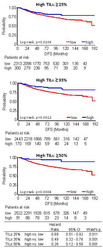 Figure 3: TILs association with patient disease-free survival (DFS) in 2613 breast cancer patients. High TILs at all cut-offs examined conferred longer DFS.