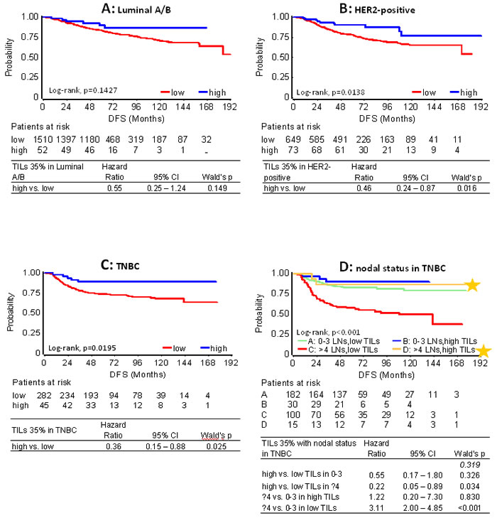 Figure 4: Effect of high TILs on patient DFS with respect to clinical breast cancer subtypes. Results are shown for high TILs at the 35% cut-off. In all subtype categories A. - C. high TILs were associated with longer DFS. In A. although high TILs are not considered prognostic in Luminal A/B disease, patients with such tumors who did not relapse within the first 5 years remained relapse free for more than 15 years. In B. HER2-positive patients were treated with and without trastuzumab. D. Patients with unfavourable nodal status and high TILs (yellow star) fared equally well as patients with favourable nodal status, where TILs levels were not associated with outcome.