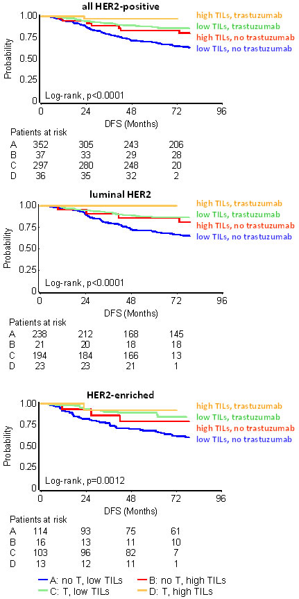 In conclusion, the presented pooled analysis supports the need for the histological assessment of TILs density as a major marker of outcome along with nodal status in breast cancer patients treated in the adjuvant setting. No clear predictive role was revealed for trastuzumab benefit with this marker but it is useful to know that trastuzumab-treated patients with high TILs fare best. Distinguishing LPBC as a distinct entity with excellent prognosis in the adjuvant setting appears clinically important for treatment decisions, while using high TILs cut-offs may identify patients who would benefit from agents recharging their anti-tumor immune response. The present findings merit validation in independent large cohorts by taking into account the low rate of high TILs tumors in patients with operable high-risk breast cancer.