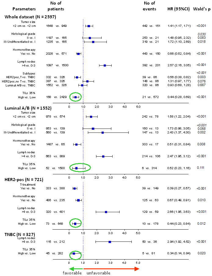 Figure 6: Forest plot showing the strongly significant independent favourable effect of high TILs on patient DFS. Multivariable models for the entire cohort and for breast cancer subtypes are shown. High TILs, here shown according to the 35% cut-off, had a constantly favourable effect on patient outcome in all settings (green circles).