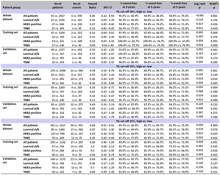 Table 1: Univariable analyses (Log-rank and Cox) showing the effect of high TILs at all 3 cut-offs in the training and validation sets with respect to patient disease-free survival