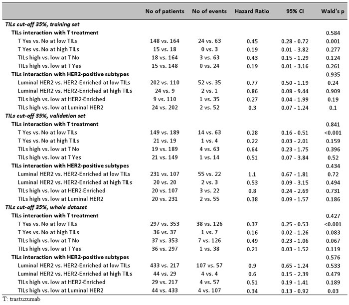 Figure 5: Effect of TILs with respect to trastuzumab (T) in HER2-positive patients. Results are shown for high TILs at the 35% cut-off. Whether statistically significant or not, high TILs were favourable in every context examined (all HER2-positive and HER2-positive subtypes). Trastuzumab significantly benefitted patients with low TILs but this effect, although present, was insignificant for patients with high TILs.