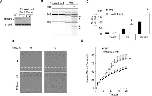 Targeted disruption of the RNase L gene in mouse embryonic fibroblasts (MEF) enhances migration, whereas over-expression of RNase L reduces migration