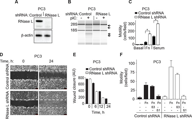 Figure 2: RNase L depletion by RNAi increases migration of PC3 cells. (A) RNase L and β-actin levels in PC3 cells stably expressing control or RNase L shRNAs as determined in immunoblots. (B) RNase L activity determined by rRNA cleavage in response to pIC transfection monitored in RNA chips (Agilent). (C−E) Migration of PC3 control shRNA- and RNase L shRNA-expressing cells by either (C) transwell assays or by (D, E) scratch wound healing assays. AU, arbitrary units. (F) Cells were pre-treated with blocking integrin β1 (β1) or integrin alpha V β3 (β3) antibodies for 30 min before plating into transwells measuring migration in response to FN. C-F Data are shown as the mean ± SD each from a single experiment with 3 technical replicates. *p < 0.05 by Student’s two-tailed t tests. The experiments were conducted 3 times (biological replicates) with similar results.