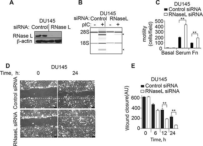 Figure 3: RNase L depletion by RNAi increases migration of DU145 cells. (A) RNase L and β-actin levels in DU145 cells transfected with control or RNase L siRNA oligonucleotides as determined in immunoblots. (B) RNase L activity determined by rRNA cleavage in response to pIC transfection monitored in RNA chips (Agilent). (C−E) Migration of DU145 control shRNA- and RNase L shRNA-expressing cells by either (C) transwell assays or by (D, E) scratch wound healing assays. AU, arbitrary units. C–E. Data are shown as the mean ± SD each from a single experiment with 3 technical replicates. **p < 0.001 by Student’s two-tailed t tests. The experiments were conducted 3 times (biological replicates) with similar results.