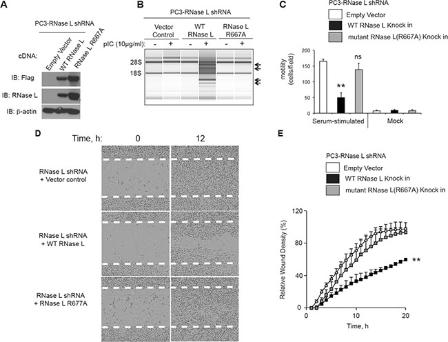 Figure 5: The catalytic domain of RNase L is required for inhibition of PC3 cell migration. (A) Levels of Flag-tagged WT RNase L, Flag-tagged R667A mutant RNase L and β-actin in immunoblots of extracts of PC3 cells stably-expressing shRNA against RNase L and infected with the indicated cDNAs in lentiviruses followed by drug selection. Immunoblots were probed with antibodies against the Flag epitope (top), monoclonal antibody against human RNase L (middle), and against β-actin (bottom). (B) RNA chip results (Agilent) of PC3 cells (as indicated) that were mock transfected or transfected with pIC. (C) Cell migration in transwells in response to serum as compared with BSA (mock). (D, E) Scratch wound healing assays of PC3 cells in which RNase L was depleted with shRNA and then transfected with empty vector, WT RNase L, or mutant R668A RNase L cDNAs (as indicated). (C−E) Data are shown as the mean ± SD each from a single experiment with (C) 3 and (E) 6 technical replicates. **p < 0.001by Student’s two-tailed t tests. The experiments were conducted 3 times (biological replicates) with similar results.