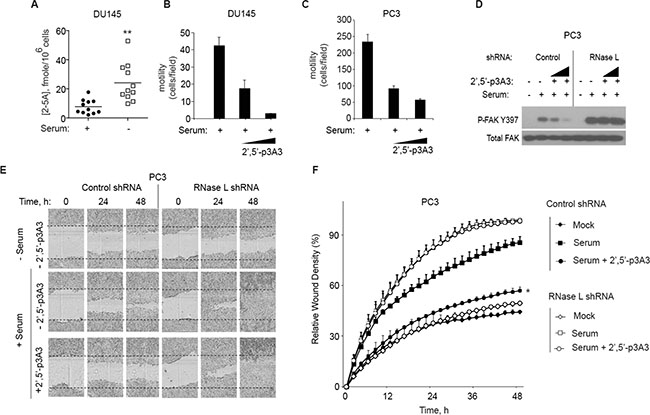 Figure 6: 2-5A inhibits cell migration. (A) DU145 cells were incubated in the presence or absence of serum for 24 h and intracellular 2–5A was measured in cell extracts by FRET assays [28, 29]. Eleven biological replicates with means are shown. (B, C) DU145 cells and PC3 cells, respectively, were serum starved for 12 h and transfected with 2–5A[p35′(A2′p5′)2A] (100 nM or 200 nM) for 1 h. Cells were trypsinized and transferred into a transwell plate. The assay was done for 5 h with 10% FBS as the attractant and migrating cells were counted and averaged from three wells. Results from 3 technical replicates each are shown. The experiment was conducted 3 times (biological replicates) with similar results. (D) FAK phosphorylation after 2–5A transfection in PC3 cells expressing control shRNA or RNase L shRNA by immunoblot assay with monoclonal antibody to FAK(Y397), and Total FAK-monoclonal antibody. (E, F) PC3 cells expressing control shRNA or RNase L shRNA were serum starved for 12 h and mock transfected or transfected with 2–5A[p35′(A2′p5′)2A] (100 nM) and their migration in absence or presence of serum until 48 h was measured by wound healing assays (as indicated). For each time point, wound closure was measured using Incucyte-ZOOM software. Data are shown as the mean ± SD. The experiment shown includes 6 biological replicates. *p < 0.05, **p < 0.001by Student’s two-tailed t tests.