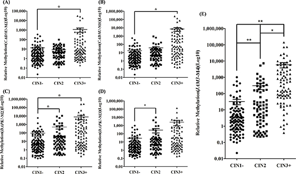 27. Bierkens M, Hesselink AT, Meijer CJ, Heideman DA, Wisman GB, van der Zee AG, Snijders PJ, Steenbergen RD. CADM1 and MAL promoter methylation levels in hrHPV-positive cervical scrapes increase proportional to degree and duration of underlying cervical disease. Int J Cancer. 2013; 133:1293–1299.