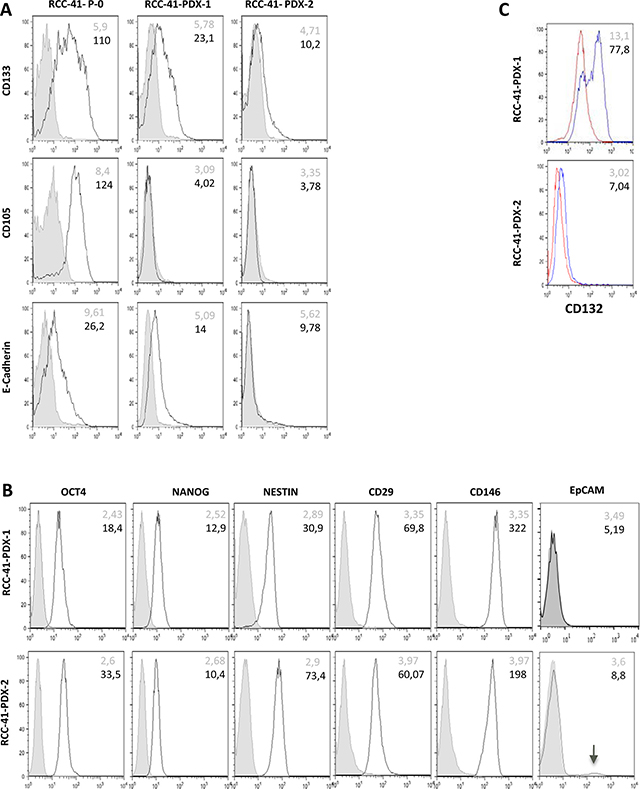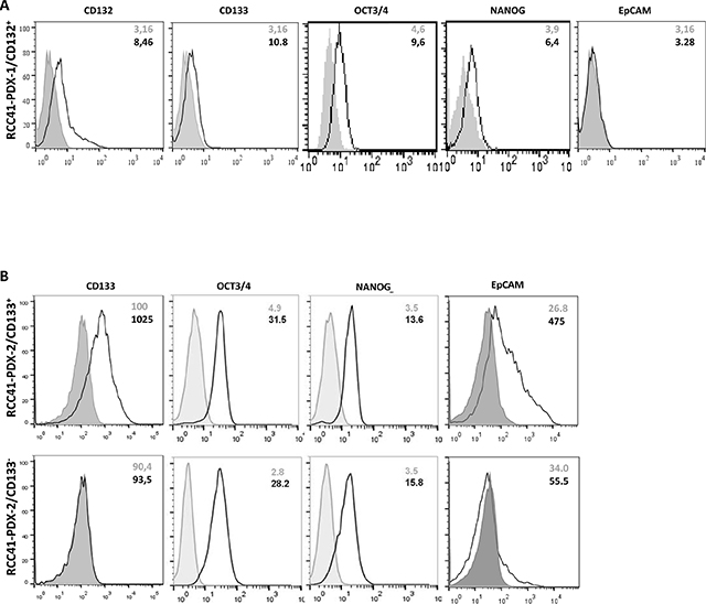 Figure 2: FACS analysis of stem cell and tumor markers in sorted RCC-41-PDX-1/CD132+, RCC-41-PDX-2/CD133+ and RCC-41-PDX-2/CD133– cells. (A) Expression level of CD132, CD133, OCT3/4, NANOG, and EpCAM in RCC-41-PDX-1/CD132+ sorted cells. Results are representative of those obtained in three experiments. (B) Expression level of CD133, OCT-3/4, NANOG, and EpCAM in RCC-41-PDX-2/CD133+ and RCC-41-PDX-2/CD133– sorted cells. Results are representative of those obtained in three experiments. For (A) and (B), grey histograms correspond to cells incubated with the isotype-matched control antibody, and black outline histograms correspond to the analyzed markers. Grey numbers within panels correspond to Mean Fluorescence Intensity (MFI) of cells incubated with the isotype-matched control antibody, while black numbers correspond to MFI of the analyzed markers.