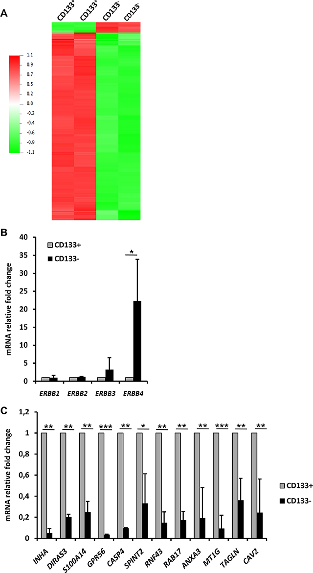 Figure 4: mRNA expression profiles of RCC41-PDX-2/CD133– and RCC41-PDX-2/CD133+ subsets. (A) Microarray analysis of CD133+ and CD133– RCC41-PDX-2 cells. Two independent biological replicates are represented. (B, C) Comparative mRNA expression of ERBB receptors (B) and tumor suppressor genes (C) in CD133– and CD133+ RCC41-PDX-2 cells by RT-qPCR. Presented results are mean of three independent experiments with *p < 0.05, **p < 0.005, and ***p < 0.0005.