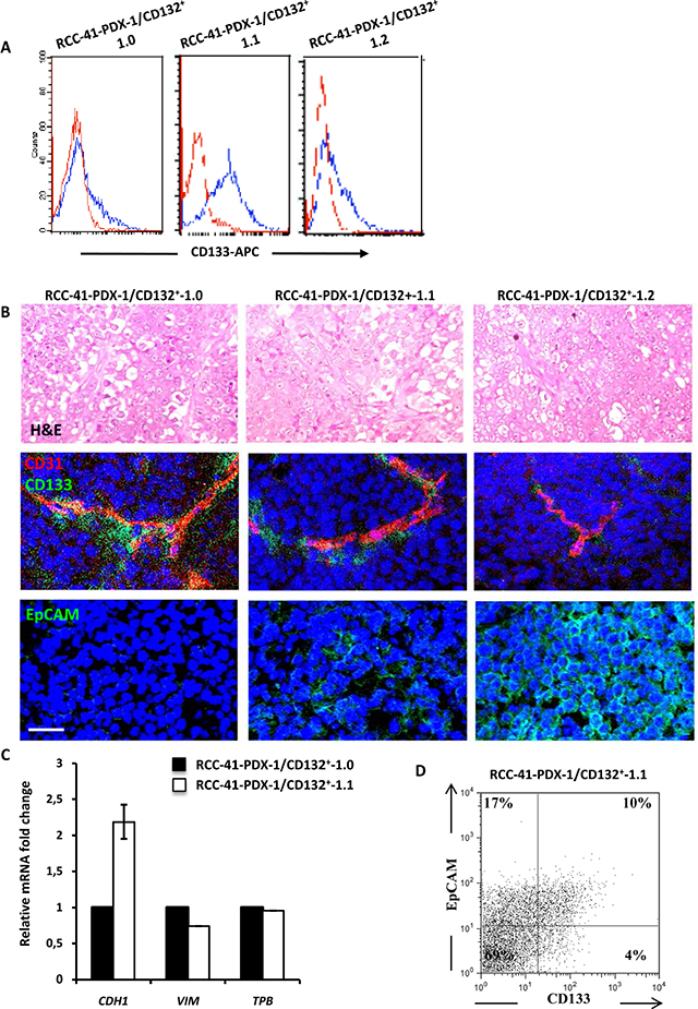 Figure 5: Tumorigenic potential of human renal RCC-41-PDX-1/CD132+ in SCID mice. (A) Flow cytometry analysis of CD133 expression in RCC-41-PDX-1/CD132+ cell suspensions recovered from serial xenografts in SCID mice. Red outline histograms correspond to analyzed markers, and blue outline histograms correspond to cells incubated with the isotype-matched control antibody. (B) Vessel staining (CD31) and serial tumor formation by RCC-41-PDX-1/CD132+ cells subcutaneously injected in SCID mice. Top row: Representative hematoxylin and eosin staining showing the morphological appearance of an undifferentiated renal carcinoma with rare clear cells. Middle row: Representative immunohistochemistry of serial tumor sections showing positivity for human CD31 using a mAb that did not cross-react with the mouse CD31 (tumor vessels) and human CD133. CD133+ cells show a typical peri-vascular distribution. Bottom row: Representative immunohistochemistry of serial tumor sections showing positivity for human EpCAM. Original view × 40 (top) and × 60 (middle and bottom). Data are representative of 3 experiments with similar results. (C) Quantitative PCR analysis of E-cadherin (CDH1) and Vimentin (VIM), expression in RCC-41-PDX-1/CD132+ cells. Data were normalized using TATA binding gene mRNA (TBP), as endogenous control. (D) Flow cytometry analysis of CD133 and EpCAM expression in RCC-41/PDX-1/CD132+-1.1 cell suspension recovered from serial xenografts in SCID mice.