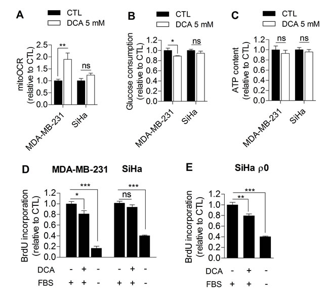Figure 2: DCA significantly influences the metabolism and proliferation of glycolytic but not oxidative cancer cells. A. Mitochondrial oxygen consumption rate, B. glucose consumption, C. intracellular ATP content and D. proliferation of MDA-MB-231 (glycolytic) and SiHa (oxidative) human cancer cells after 48 h dichloroacetate (DCA) 5 mM treatment. E. Proliferation of mitochondria-depleted (ρ0) SiHa cancer cells after 48 hours DCA 5 mM treatment. Medium containing no FBS was used as positive control in proliferation experiments. Two-sided t test A.-C. or one-way ANOVA with Bonferroni post-hoc test D.-E. *p < 0.05, **p < 0.01, ***p < 0.001, ns, not significant. Results are expressed as the relative change from control cells and as means ± SEM.