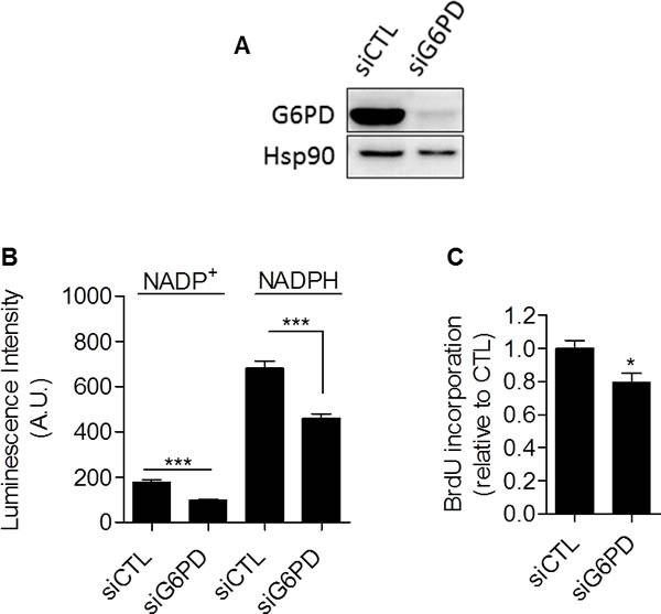 Figure 4: Glucose-6-phosphate dehydrogenase inhibition with siRNA reduces proliferation of glycolytic cancer cells. MDA-MB-231 cancer cells were transfected with siRNAs targeting G6PD (siG6PD) or non-targeting siRNAs (siCTL). 48 hours after transfection, cells were subjected to A. immunoblot analysis using Hsp90 as loading control, B. NADP+ and NADPH levels quantification and C. DNA synthesis measurement. Two-sided t test. *p < 0.05, ***p < 0.001. Results are expressed as means ± SEM.