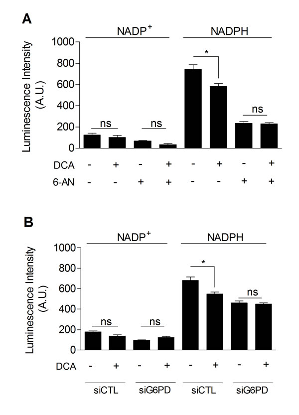Figure 5: DCA decreases PPP activity. A. Intracellular NADP+ and NADPH levels measured in MDA-MB-231 cancer cells treated with ± DCA (5 mM, 48 h) and ± 6-AN (100 µM, 48 h). B. Intracellular NADP+ and NADPH levels measured in MDA-MB-231 cancer cells transfected with siRNAs against G6PD (siG6PD) or non-targeting siRNAs (siCTL) and treated with ± DCA. One-way ANOVA with Bonferroni post-hoc test. *p < 0.05, ns, not significant. Results are expressed as means ± SEM.