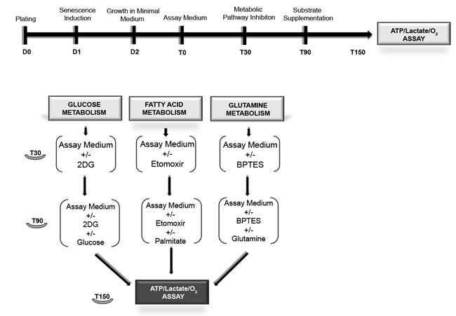 Figure 1: Workflow for metabolic assays. MSC were in growth medium (D0). After 24h stress-induced senescence was triggered as described in methods (D1). Chronic senescent cells were plated in growth medium (D0). After 24 hours, we performed medium change without use of stressors (D1). The day after (D2), we replaced the growth medium with the substrate-limited medium. After 24 hours (T0), we changed the substrate-limited medium with the assay medium. After 30 min (T30) in a group of samples, we added the metabolic pathway inhibitor drugs (2D-glucose, etomoxir and BPTES). After 60 min (T90), we added the relative substrates (glucose, palmitate and glutamine) in all samples. Following 60 min incubation (T150), we performed the lactate, ATP and O2 assays.