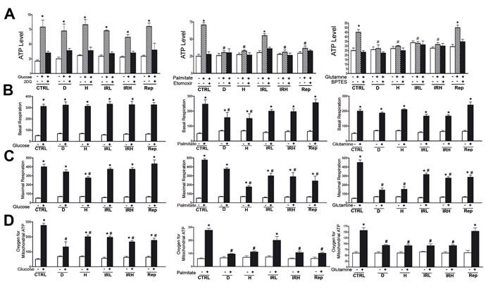 Figure 4: Evaluation of metabolic activity in senescent cells. A. ATP level measurement. Intracellular ATP level was determined using the ATP Colorimetric/Fluorometric Assay. Cells were incubated in medium containing glucose (left graph) or palmitate (middle graph) or glutamine (right graph). The ATP level was measured in absence of energy substrate (white bars), in presence of specific substrate (gray bars) and in the presence of substrate and its inhibitor (black bar). For every condition, the asterisk (*) denotes significant differences (p < 0.05) between ATP level in a medium with a specific substrate (gray bar) and a medium without substrate plus its inhibitor (black bar). Data are expressed in arbitrary units (± SD, n = 3). B. Basal oxygen consumption rate. We used MitoXpress® Xtra assay for measurement of extracellular oxygen consumption rates (OCR). Cells were incubated in medium containing glucose (left graph) or palmitate (middle graph) or glutamine (right graph). For every condition, the asterisk (*) denotes significant differences (p < 0.05) between OCR in a medium with a specific substrate (black bar) and a medium without energy substrates (white bar). The hash symbol (#) denotes differences between ATP in control healthy cells and senescent cells (D, H, IRL, IRH, Rep). Data are expressed in arbitrary units (± SD, n = 3). C. Maximal respiration rate. OCR was measured following sequential addition of FCCP, that is, a protonophore and uncoupler of oxidative phosphorylation in mitochondria. Cells were incubated in medium containing glucose (left graph) or palmitate (middle graph) or glutamine (right graph). For every condition the asterisk (*) denotes significant differences (p < 0.05) between maximal OCR in a medium with a specific substrate (black bar) and a medium without energy substrates (white bar). The hash symbol (#) denotes differences between OCR in control healthy cells and senescent cells (D, H, IRL, IRH, Rep). Data are expressed in arbitrary units (± SD, n = 3). C. Oxygen for mitochondrial ATP production. OCR was measured following sequential addition of olygomycin that is inhibitor of the F0 part of H+/ATP-synthase in mitochondria. Cells were incubated in medium containing glucose (left graph) or palmitate (middle graph) or glutamine (right graph). For every condition the asterisk (*) denotes significant differences (p < 0.05) between OCR in a medium with a specific substrate (black bar) and a medium without energy substrates (white bar). The hash symbol (#) denotes differences between OCR in control healthy cells and senescent cells (D, H, IRL, IRH, Rep). Data are expressed in arbitrary units (± SD, n = 3).