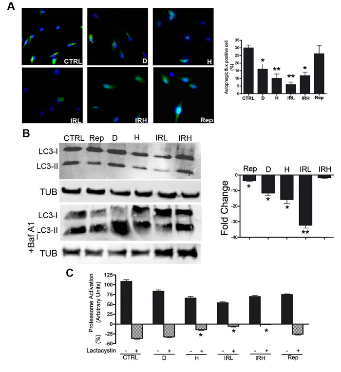 We measured by western blot the levels of LC3-I and LC3-II that are two isoforms of the microtubule-associated protein 1 light chain 3 (LC3), a reliable marker of autophagosome. We determined the autophagic flux by tracking the conversion of LC3-I proteins to LC3-II that occurs when autophagy is induced [20]. We determined the level of LC3 isoforms, both in the presence and absence of bafilomycin A1, an inhibitor of lysosomial degradation. In D, H and IRL cells we observed a reduction of autophagic flux, suggesting an impairment of the autophagy process (Figure 5B). Inhibition of autophagy in these cells was confirmed by Cyto-ID Autophagy Detection assay. The percentage of cells expressing active autophagic vacuoles was significantly decreased in D, H and IRL cells (Figure 5A). We detected also a reduction of cells with active vacuole in IRH sample. This may suggest that process of autophagy in these was not blocked (flux is comparable to control) but the number of active vacuoles is reduced.