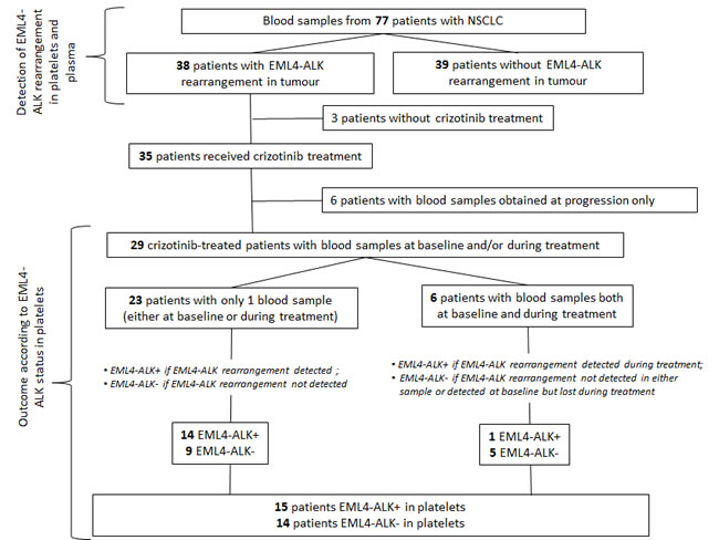 This study was designed with three parallel objectives: firstly, to determine the sensitivity and specificity of detecting EML4-ALK rearrangements in platelets and plasma, correlated with matched tissue biopsies; secondly, to examine the potential impact of the EML4-ALK rearrangement in platelets on outcome to crizotinib; thirdly, to test the feasibility of monitoring a patient throughout treatment based on assessment of the EML4-ALK rearrangement in platelets.