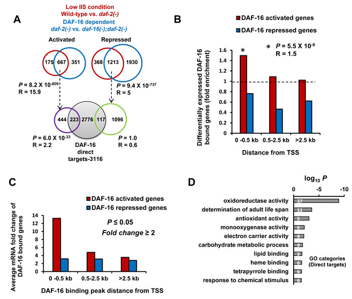 Figure 2: Promoter-proximal binding of DAF-16 ensures optimal transcriptional response. A. Genes activated (N=667) or repressed (N=1213) in daf-2(-) in a DAF-16-dependent manner were overlapped with genes in which DAF-16 binds within 2.5 kb promoter region upstream of TSS (Grey circle; lower panel) to obtain 223 significant (Hypergeometric test) DAF-16 direct targets that are transcriptionally relevant. B. DAF-16-dependent genes that have peaks located within 0.5 kb of TSS are more likely (Hypergeometric test) to be activated in daf-2(-). C. Average mRNA fold change of genes activated or repressed in daf-2(-). The genes were categorized based on distance of DAF-16 peaks from TSS. D. Gene annotation enrichment analysis highlights biological functions of genes directly activated by DAF-16.