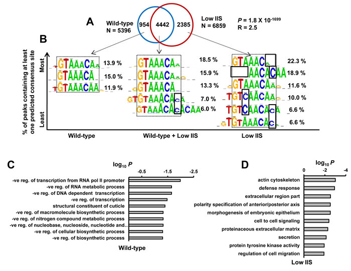 Next, we focused on the FOXO consensus sequences in the DAF-16 peaks found exclusively in WT or daf-2(-) as well as from those commonly observed in the two strains. DAF-16 peaks, present exclusively in WT, were near match to the core FOXO consensus sequence [11, 28] (Figure 4B, left). These genes were found to function mainly in negative regulation of transcription and metabolic processes, as determined by Gene Ontology analysis using DAVID [13] (Figure 4C). Interestingly, in DAF-16 peaks exclusive to daf-2(-), several variants of the FOXO consensus sequences were found apart from the core consensus motif (Figure 4B, right). These categories of genes functions mostly in defence response, cell to cell signalling etc (Figure 4D).This suggests that activated DAF-16, as in daf-2(-), may have higher binding affinity and bind imperfect FOXO consensus sequences. Alternatively, they may require other factors to assist in binding.