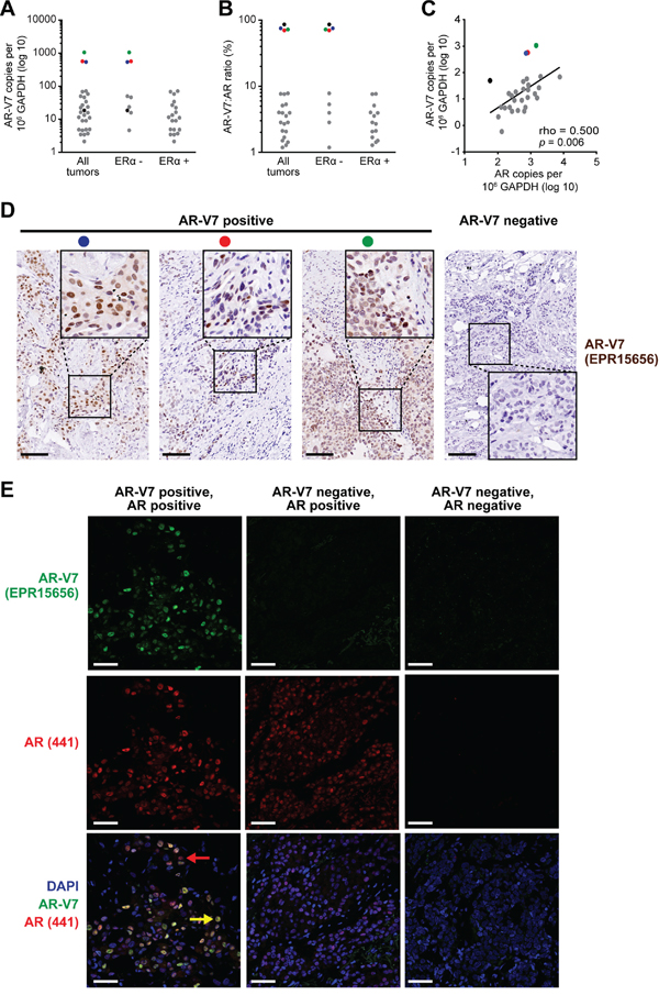 Figure 2: The AR variant AR-V7 is expressed in clinical breast cancer samples. A. Expression of AR-V7 in ERα-positive (n = 35) and ERα-negative (n = 19) breast cancers, as determined by qRT-PCR. A Cq < 35 was used as a cut-off for determining AR-V7 positivity. AR-V7 copy number was calculated as described in Materials and Methods. B. Ratio of AR-V7 as a proportion of AR-FL (in AR-V7-positive tumors). C. Correlation between AR-V7 and AR-FL copy number in AR-V7-positive tumors. Pearson’s correlation rho and p values are shown. Note that three tumors with high AR-V7 mRNA levels (red, blue green) or a high AR-V7:AR-FL ratio (black) are identifiable in (A)-(C) by color. D. Detection of AR-V7 protein by IHC in 3 breast tumors with high levels of AR-V7 mRNA expression (left). Positive staining was not detected in specimens that do not express AR-V7 mRNA (a representative is shown on the right). Inset images of higher magnification demonstrate strong nuclear staining. Colored dots enable matching of samples to (A)-(C) Scale bars are 100 microns. E. Detection of AR-V7 protein by IF and co-localization with AR-FL. Shown are an AR-V7 positive tumor (left), an AR-V7-negative but AR-positive tumor (middle), and a dual-negative tumor (right). Nuclei were stained with DAPI. In the bottom left image, a yellow arrow indicates a representative cell with strong AR-FL and AR-V7 staining and a red arrow indicates a representative cell with strong AR-FL staining but weak or no AR-V7 staining. Scale bars are 50 microns.